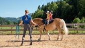 zwei Mädchen sitzen auf einem Pferd am Reitplatz des Spa- & Familien-Resorts Krone unter Beobachtung einer Trainerin..
