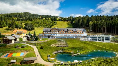 Winterliche Luftaufnahme des Familienhotels Petschnighof in Kärnten.