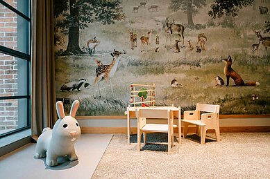 Die Räumlichkeiten der Kinderbetreuung befinden sich in der restaurierten Scheune. Hier erwarten euch neben hellem Werkraum und liebevollem Kleinkindbereich ein Still- und Schlafbereich sowie Wickelräume für die kleinsten Gäste.