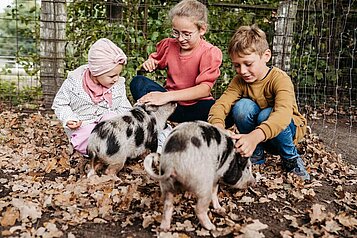 Der weitläufige Hof mit seinen vielen Tieren, einem eigenen Gemüsegarten und zahlreichen Spielorten ist für Kinder ein einziges Natur-Abenteuer.