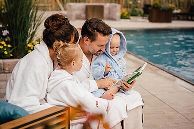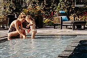 Im Indoor-Schwimmbad gibt es ein separates Babybecken. Und auch der Außenpool mit kleinen Baby-Pool, schön beheizt und wohl temperiert, lädt die kleinsten Gäste zum Planschen ein. Auf der geschützten, umlaufenden Terrasse könnt ihr euch auf den Liegen sonnen und entspannen.