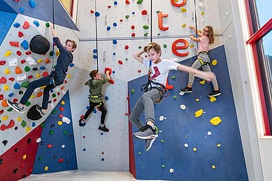 Das Highlight des Familienhotels ist die riesige Erlebniswelt auf vier Etagen. Im zweiten Stock findet ihr eine extra Ebene nur für Teens. Tischfußball, 6er-Hockeytisch, digitaler Spieletisch, Fun4four, Tischtennis und eine Chill-out-Lounge sorgen für coole Stunden. Auf dem 7,5 m hohen Kletterturm mit Boulder- und Vorstiegswand können sich eure Teenager wunderbar austoben.