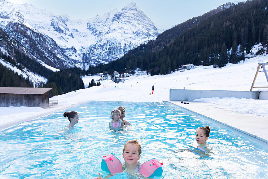 Auch im Familienhotel selbst könnt ihr eure Freizeit bestens verbringen. Zum Beispiel beim Planschen im ganzjährig beheizten Outdoor Infinity-Panoramapool oder Freiluft-Whirlpool. Als Gäste des Familienhotels erhaltet ihr außerdem freien Eintritt in das zehn Kilometer entfernte Freibad „Prad“.